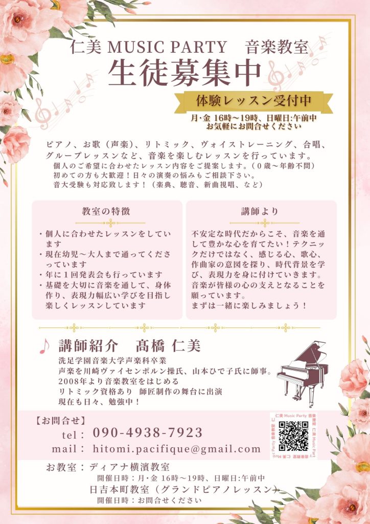 主なレッスン日:月曜 ・金曜 16時~19時・日曜 午前中【お問合せ先】仁美MUSIC PARTY 詳細はチラシをご覧ください>>>